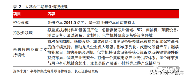 半導(dǎo)體產(chǎn)業(yè)具有投資規(guī)模大,回報(bào)周期長的特點(diǎn),因此需要國有資本的支持,國家集成 電路產(chǎn)業(yè)投資基金(大基金)首期募資 1387 億元左右。大基金將集成電路制造作為一 期的投資重點(diǎn),占比達(dá) 67%左右,而設(shè)備/材料僅占 6%左右。大基金二期于 2019 年底 成立,注冊資本 2041.5 億元,共包含中國電信、聯(lián)通資本、中國電子信息產(chǎn)業(yè)集團(tuán)、 紫光通信等在內(nèi)的 27 位股東。大基金二期預(yù)期將加大對半導(dǎo)體上游設(shè)備和材料的投入 力度,材料及設(shè)備行業(yè)龍頭企業(yè)或?qū)⒅苯邮芤妗=刂?2022Q1,大基金二期投資裝備材 料類 75 億元,占比 10%。