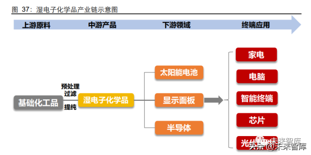 超純化工試劑,雜質(zhì)要求苛刻。濕電子化學(xué)品(Wet Chemicals)又稱工藝化學(xué)品,是 指主體成分純度大于 99.99%,雜質(zhì)離子和微粒數(shù)符合嚴(yán)格標(biāo)準(zhǔn)的化學(xué)試劑,廣泛用于芯片、顯示面板、太陽能電池、LED 等電子元器件微細(xì)加工的清洗、光刻、顯影、蝕刻、 摻雜等工藝環(huán)節(jié)。濕電子化學(xué)品是化學(xué)試劑產(chǎn)品中對品質(zhì)、純度要求最高的細(xì)分領(lǐng)域。