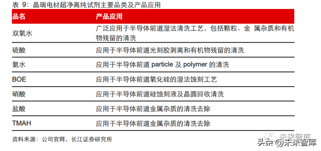 公司高純雙氧水、高純氨水及高純硫酸等產(chǎn)品品質(zhì)已達(dá)到 SEMI 最高等級 G5 水準(zhǔn),金 屬雜質(zhì)含量均低于 10ppt,半導(dǎo)體用量最大的三個(gè)高純濕化學(xué)品整體達(dá)到國際先進(jìn)水平, 可基本解決高純化學(xué)品這一大類芯片制造材料的本地化供應(yīng),實(shí)現(xiàn)半導(dǎo)體關(guān)鍵材料國產(chǎn) 化、本地化,為打造高端半導(dǎo)體產(chǎn)業(yè)鏈提供了支撐。已投產(chǎn)的主導(dǎo)產(chǎn)品獲得 SMIC、華 虹宏力、長江存儲、士蘭微等國內(nèi)知名半導(dǎo)體客戶的采購。公司其他多種超凈高純化學(xué) 品如 BOE、硝酸、鹽酸、氫氟酸等產(chǎn)品品質(zhì)全面達(dá)到 G3、G4 等級,可滿足平板顯示、 LED、光伏太陽能等行業(yè)客戶需求。