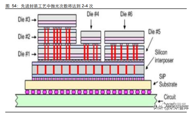 高純度硅片及先進(jìn)封裝也為拋光市場注入了新的成長動力。近兩年,先進(jìn)制程芯片的占 比越來越高,而用于先進(jìn)制程的硅片要求更高的純度,在切割成薄片以后還需要用拋光 工序來去除表面的雜質(zhì),拋光工藝在材料市場的應(yīng)用被逐漸發(fā)掘。此外,隨著摩爾定律 逐漸失效,封裝層面逐漸引入類似晶圓制造方式進(jìn)行加工處理,例如:晶圓級封裝(FOWLP)和“3D-IC”封裝技術(shù)中,多個(gè)不同的功能的芯片通過填充金屬的硅通孔(TSV) 在垂直方向?qū)崿F(xiàn)堆疊和連接,而這些工序同樣也離不開拋光的支持。