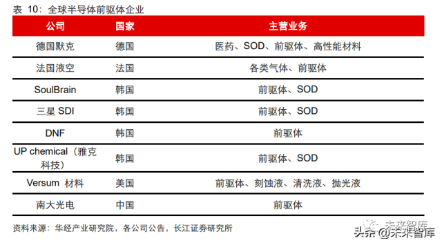國外企業(yè)寡頭壟斷前驅(qū)體市場,雅克科技通過收購 UP Chemical 進(jìn)入該領(lǐng)域。前驅(qū)體 材料具有技術(shù)門檻高、開發(fā)難度大的特點(diǎn),國外企業(yè)深耕領(lǐng)域已久,目前全球 IC 前驅(qū) 體主要生產(chǎn)商包括德國默克、法國液化空氣集團(tuán)以及韓國 UP Chemical、DNF、Mecaro 等。國內(nèi)企業(yè),雅克科技通過收購 UP Chemical 切入該領(lǐng)域。雅克科技 2021/2022H1 前驅(qū)體業(yè)務(wù)收入為 8.5/4.5 億元。南大光電在品類上已覆蓋晶圓制造所需的硅前驅(qū)體/金 屬前驅(qū)體、高 K 前驅(qū)體/低 K 前驅(qū)體的主要品類,并成功導(dǎo)入國內(nèi)領(lǐng)先的邏輯芯片和存 儲芯片量產(chǎn)制程,募集資金建設(shè)年產(chǎn) 45 噸半導(dǎo)體先進(jìn)制程用前驅(qū)體產(chǎn)品產(chǎn)業(yè)化項(xiàng)目, 主要目標(biāo)為 14nm/7nm 集成電路制程所需的新型硅前驅(qū)體產(chǎn)品的研發(fā)和產(chǎn)業(yè)化。南大光 電 2021/2022H1 前驅(qū)體業(yè)務(wù)收入為 1.7/1.1 億元。