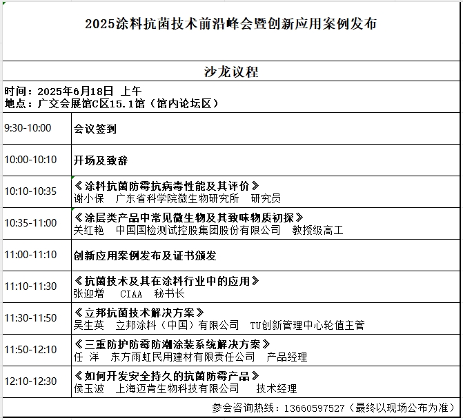 本次峰會將邀請業(yè)內(nèi)知名專家和企業(yè),就抗菌、防霉、抗病毒、防藻、防腐等技術(shù)及其在涂料行業(yè)的創(chuàng)新應(yīng)用展開專業(yè)研討,對抗菌、防霉、抗病毒、防藻、防腐涂料產(chǎn)品的性能及其評價進行介紹。同時,會議主辦方還將在會議現(xiàn)場發(fā)布抗菌、防霉、抗病毒、防藻、防腐等技術(shù)及其在涂料中的創(chuàng)新應(yīng)用案例,在展會現(xiàn)場設(shè)立創(chuàng)新應(yīng)用案例產(chǎn)品展示區(qū),集中展示抗菌、防霉、抗病毒、防藻、防腐等技術(shù)及其在涂料中的創(chuàng)新應(yīng)用,為涂料行業(yè)在大健康背景下轉(zhuǎn)型升級提供基于消費者/市場需求的技術(shù)路徑和選擇。