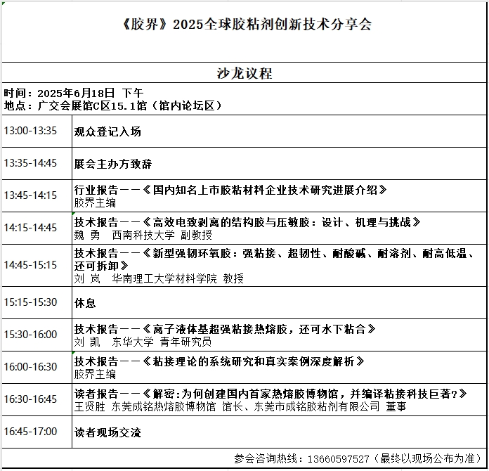 借此,《膠界》將攜手廣東智展展覽有限公司、中涂聯(lián)合國際會展(廣州)有限公司等單位,首次在廣州“2025廣州國際膠粘劑及粘接技術展”、“ICIE 2025國際(廣州)涂料工業(yè)展”期間同期舉辦線下的全球膠粘劑創(chuàng)新技術分享會!它不會是一場普通的膠粘劑會議。在這里,我們將邀請《膠界》主編與大家分享他與膠粘劑的故事,他將首次公開與讀者進行面對面的專業(yè)交流與深度對話。同時,也將邀請獨具創(chuàng)新技術的行業(yè)專家到場,分享他們最新的研究成果和寶貴的實踐經驗,把膠粘劑技術的最新進展分享給大家。