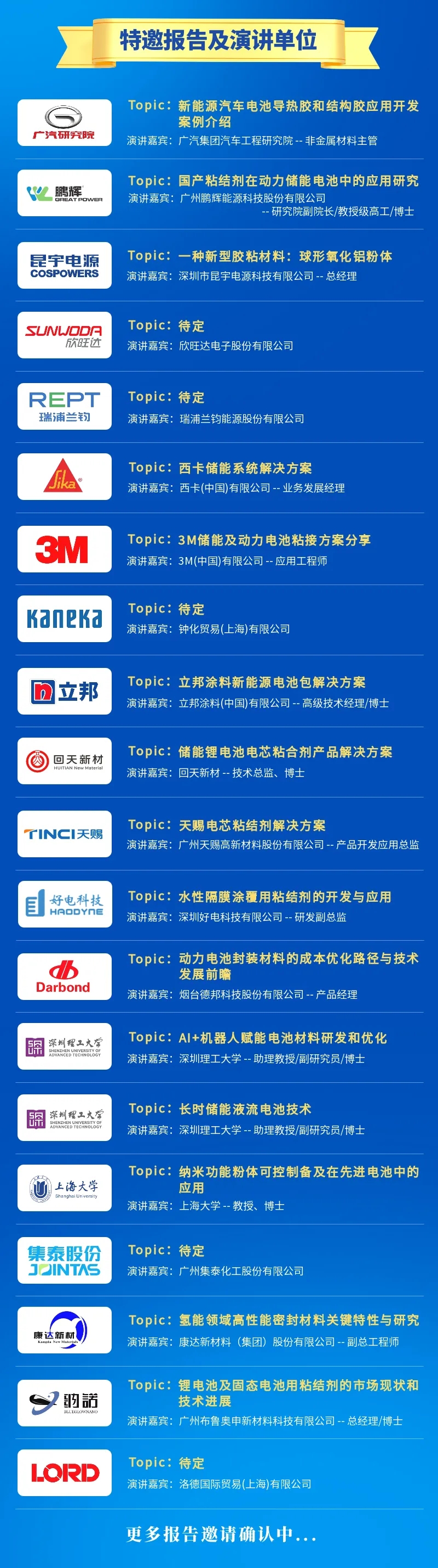 重點擬邀請欣旺達(dá)、瑞浦蘭鈞、鵬輝能源、昆宇電源、廣汽、西卡、洛德、3M、立邦、鐘化、回天、德邦、康達(dá)、集泰、天賜、好電、納諾、深圳理工大學(xué)等電池和儲能用膠及涂料產(chǎn)業(yè)的知名企業(yè)、院校的資深專家做專題發(fā)言報告。